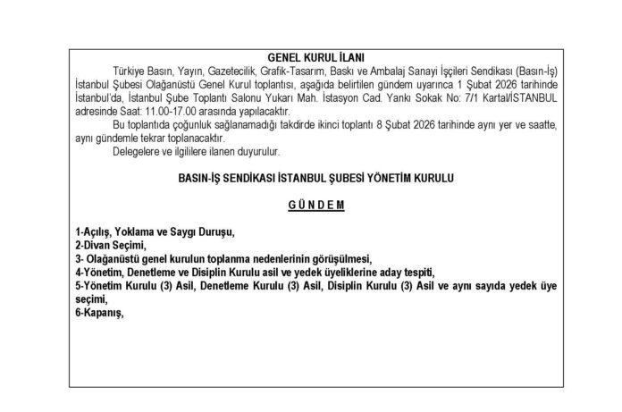 Türkiye Basın, Yayın, Gazetecilik, Grafik-Tasarım, Baskı ve Ambalaj Sanayi İşçileri Sendikası (Basın-İş) İstanbul Şubesi Olağanüstü Genel Kurul toplantısı, aşağıda belirtilen gündem uyarınca 1 Şubat 2026 tarihinde İstanbul’da, İstanbul Şube Toplantı Salonu Yukarı Mah. İstasyon Cad. Yankı Sokak No: 7/1 Kartal/İSTANBUL adresinde Saat: 11.00-17.00 arasında yapılacaktır.